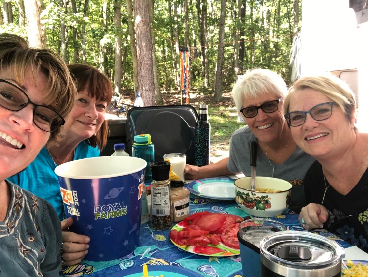 Catherine and MaryLou had already scoped out the area and were all smiles when we arrived to the area. Since the next day was Labor Day, we had a cookout complete with fresh corn and tomatoes…and gas station ”world famous” fried chicken. Tuesday, I took Kimberly to the Philly airport bright and early. My cousin Pam and her handsome beau, Rob, picked me up at the campground where we headed for a nice walk on the canal followed by a tasty draft beer and some tasty vittles as we watched the freighters go through the canal.