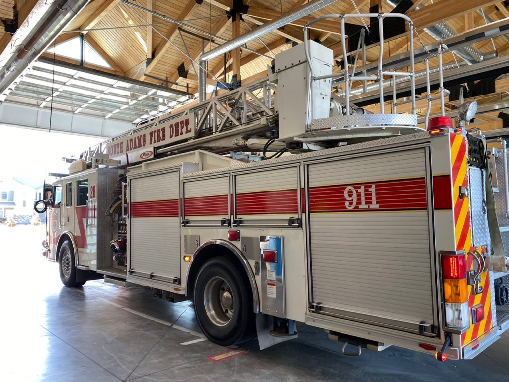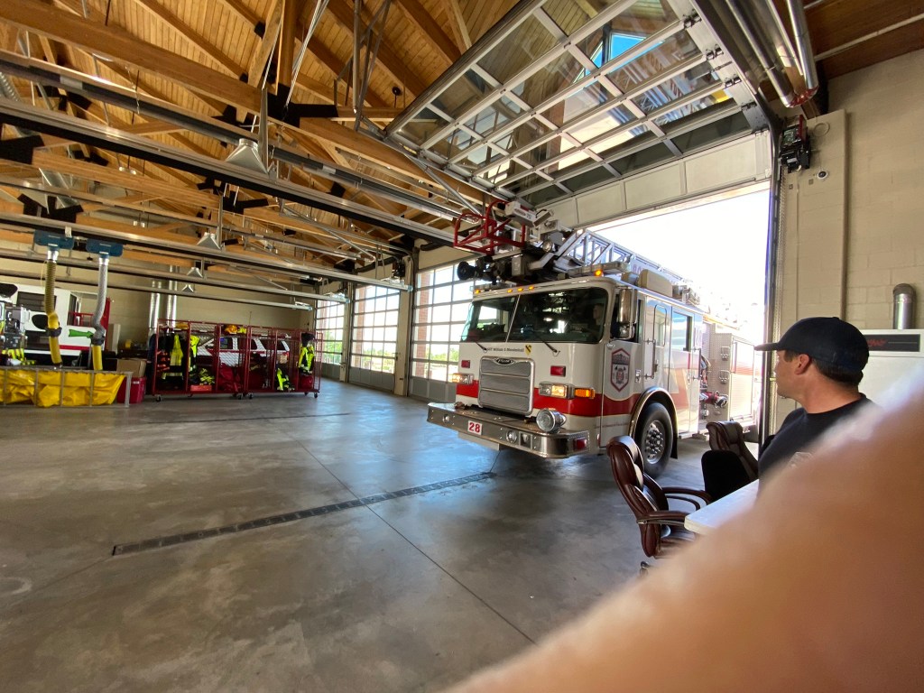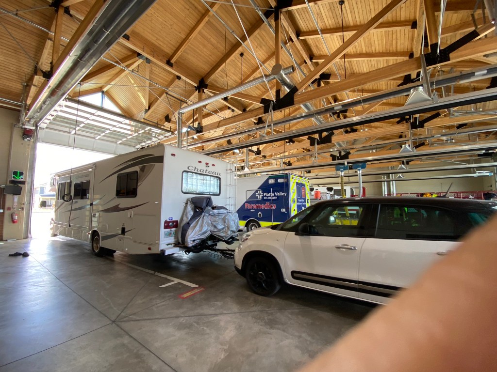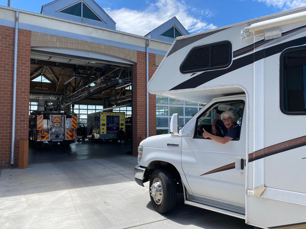 We got less than 10 miles down the road when the tires pressure monitoring system (TPMS) started beeping. We were clearly losing air out of a front tire. I was able to pull off and get us to a gas station with a air pump but it would not add any air…it just let more out. Then Jennifer saw a fire station. Jennifer goes searching for firemen and BAM the garage door opens and a high powered air compressor comes out; on wheels with a fireman to boot. We had air in the tire. Unfortunately, I was unable to turn the rig around with the toad connected so the fireman drove the fire engine out and I drive through the fire station! See pictures.